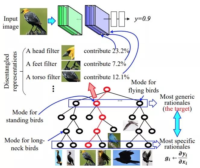 图 7:语义级 CNN 预测解释的决策树 [Zhang et al., 2018c]。CNN 学习在顶层的卷积层中运用分离式表征进行目标分类,其中每个过滤器代表一个特定的对象部分。决策树以由粗到精的方式编码隐藏在 CNN 全连接层内的各种决策模式。给定一张输入图像,决策树推断出一个解析树(红线)来定量分析 CNN 预测的基本原理,即物体的哪些部分(或滤波器)用于预测以及该部分(或滤波器)对预测有多大贡献。