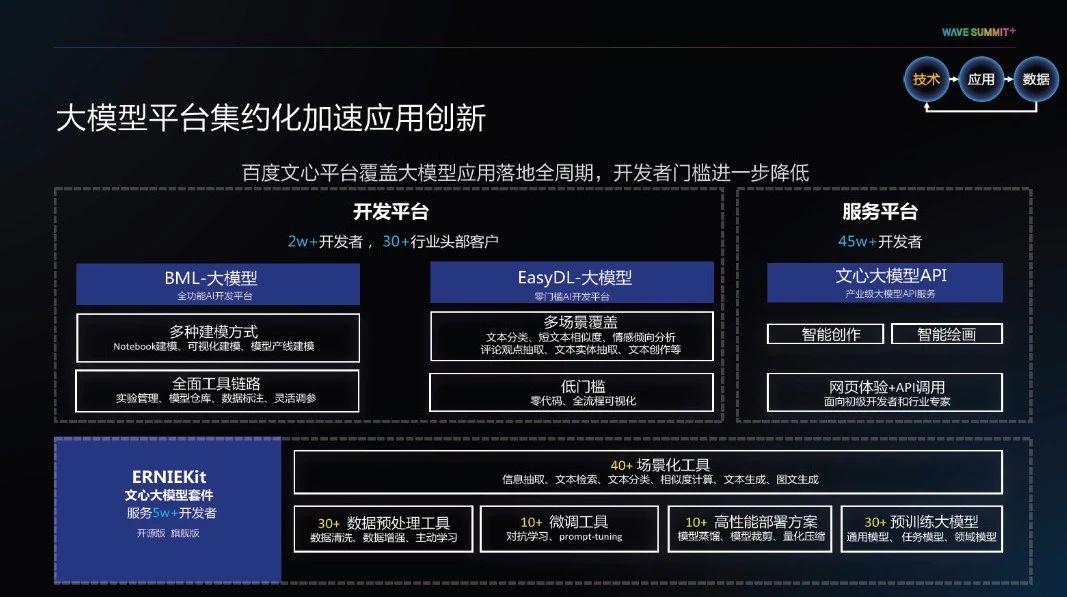 随着大模型使用门槛的降低,大模型应用呈现出集约化加速应用创新的趋势。比如百度以大模型能力为中心,构建了文心大模型套件ERNIEKit。