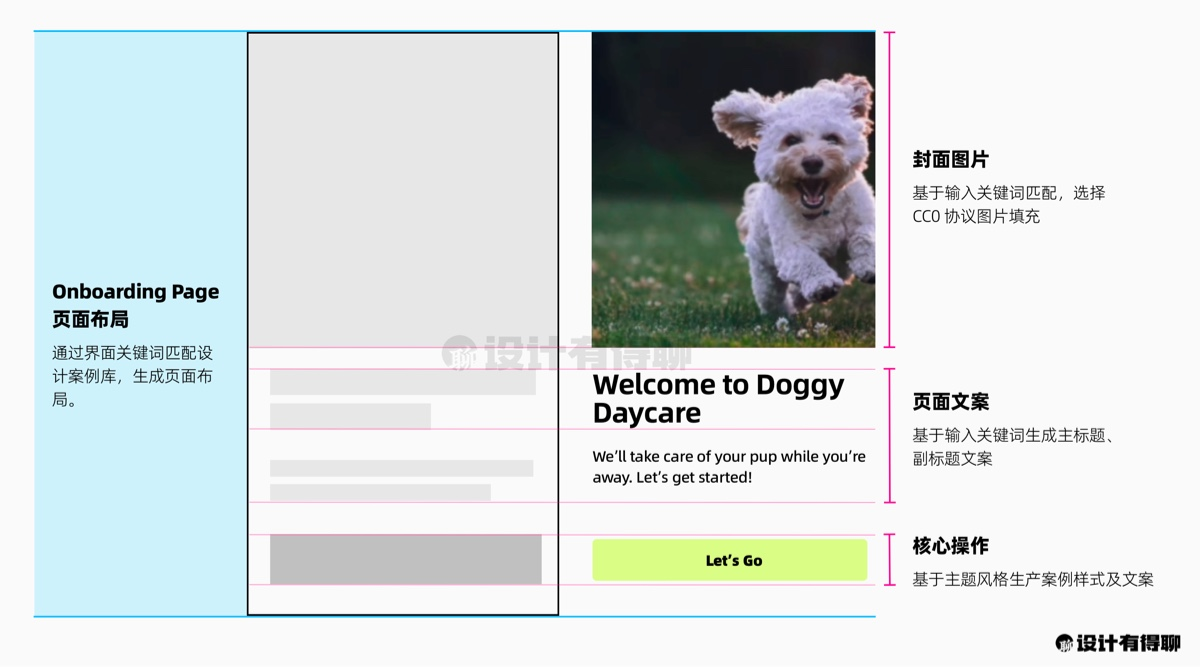 我们以Galileo 的遛狗应用为例,系统能够通过对「界面类型」和「产品类型」两个关键词属性的分析,挑选出与之匹配的模板、物料进行拼接,快速地生产用户所需要的界面。