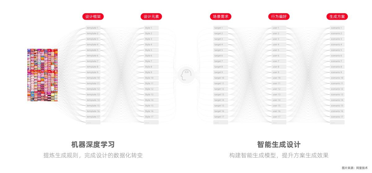 这个时候淘宝积累的大量数据就可以作为「行业规则」输入到系统中,同时在辅以设计师的专家经验,鹿班可以做达到一个初级设计师的设计要求。