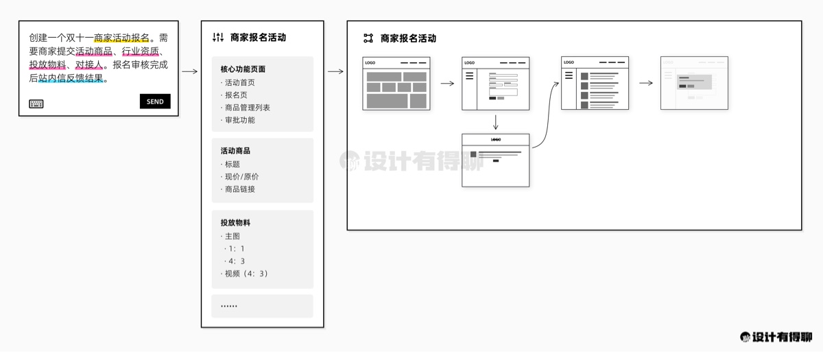早期在与玉伯的沟通中,我们就曾讨论到是否可以进一步将业务模块、流程进行封装,提供可控的配置能力来让产品、运营在语雀中写 PRD 的同时来自行生产页面,也就是通过自然语言来让机器进行设计。