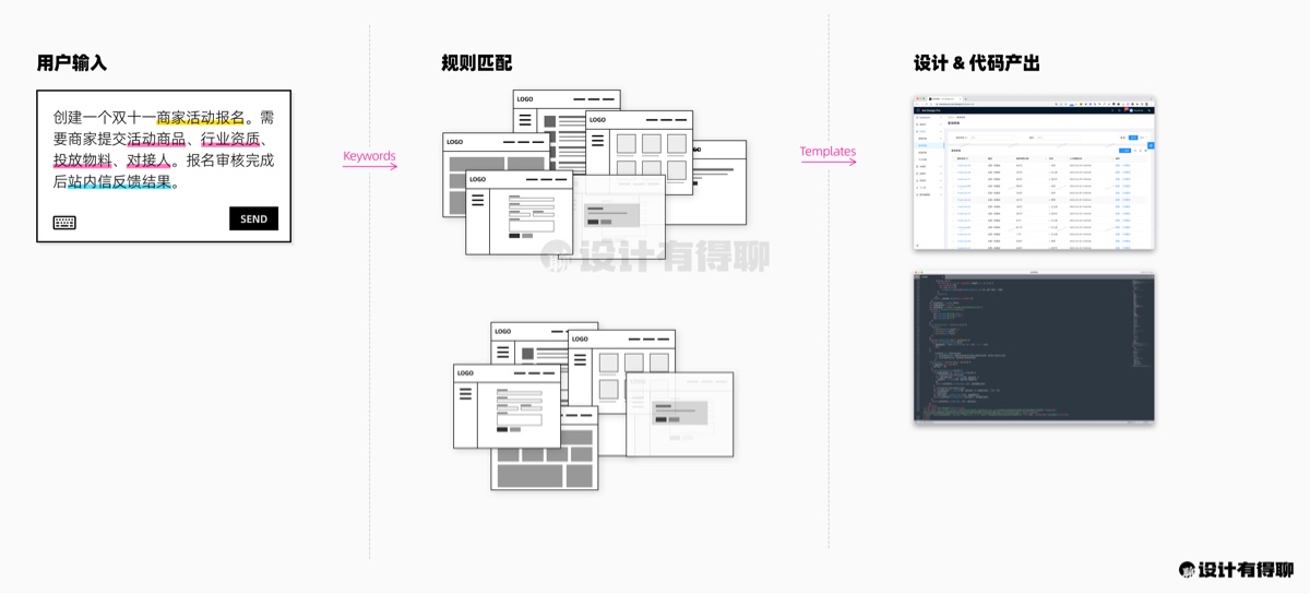 这类 AI 设计工具原理最核心的在于对“案例库”的引入,这就相当于给 AI 提供了一系列的行业属性和通用设计规则。