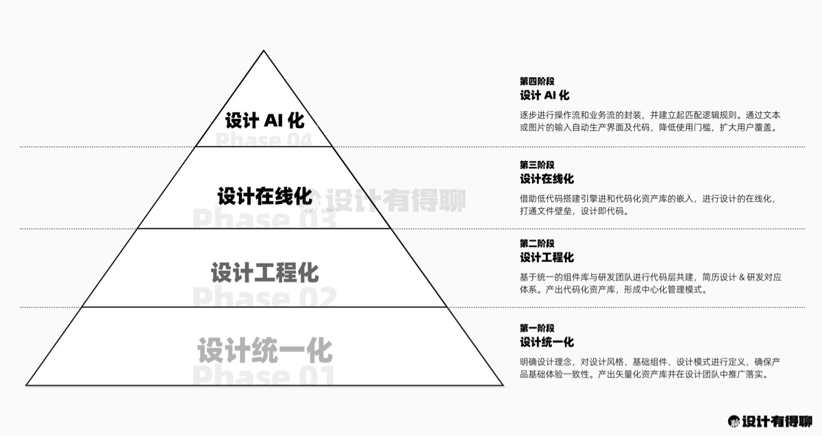 前面和大家聊了这么多的案例,最终的焦点还是回到了设计系统。在「设计有得聊」早期的文章里,曾经给大家介绍过设计系统的三个阶段,统一化 → 工程化 → 在线化。