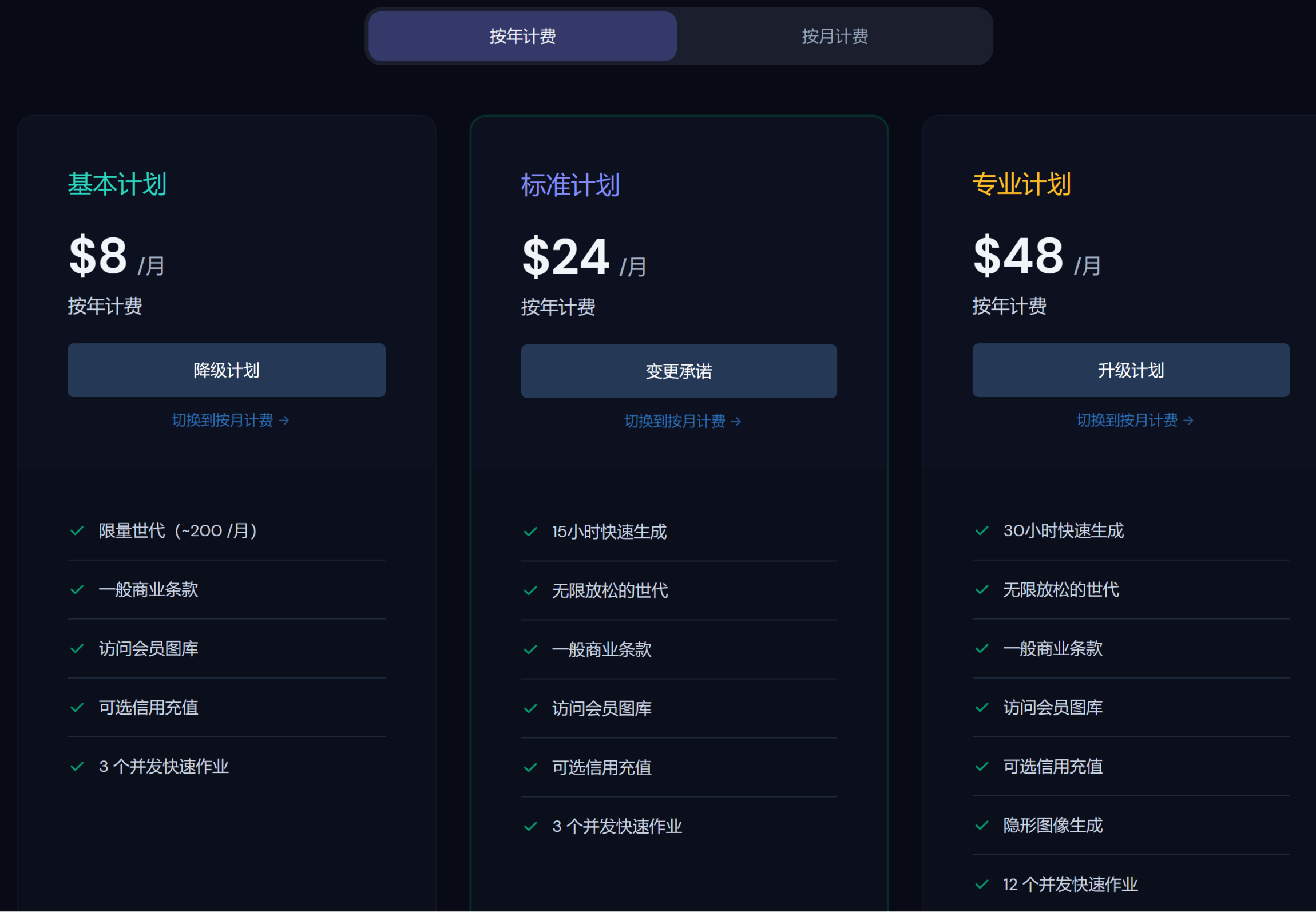 免费用户只有25次机会,且不具备商业使用权限。剩下订阅分为三个档次,分别可以进行月付或者年付,年付会有优惠。