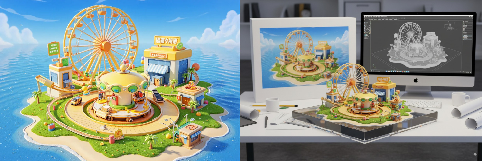 它不是简单地把图片变立体,而是创造了一个完整的“故事场景”。你看,桌面上不仅有根据原图生成的实体模型,连带底座都给安排好了。背后还有印着原图的包装盒,和一台显示着 3D 线框图的电脑!