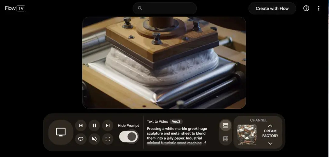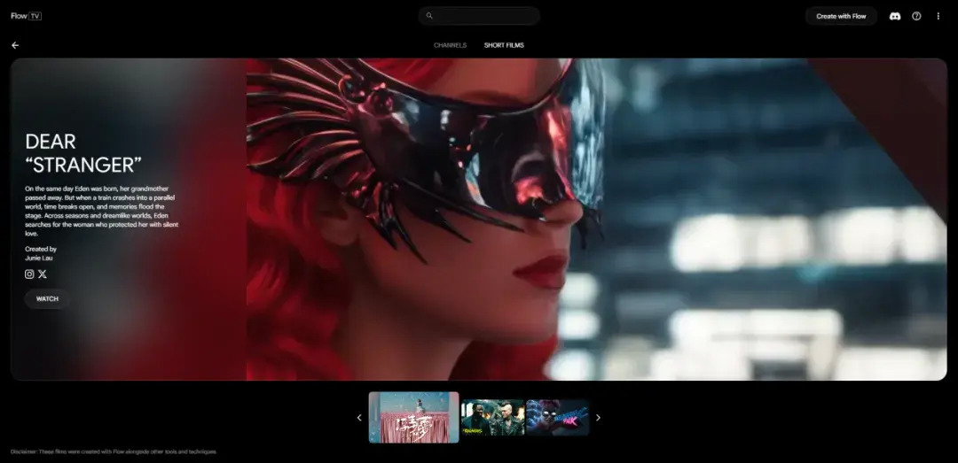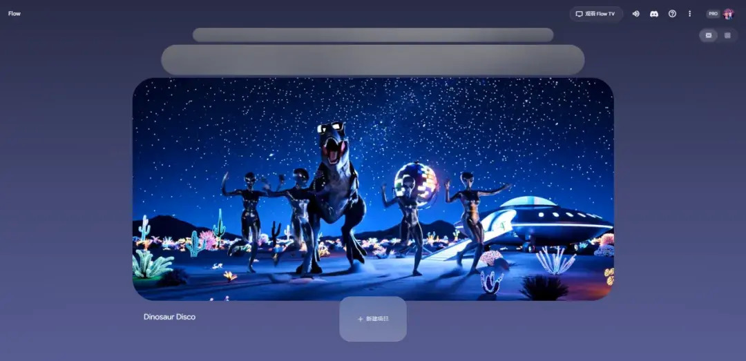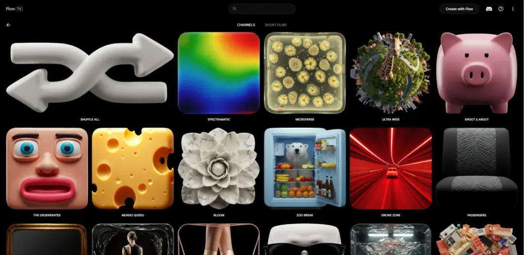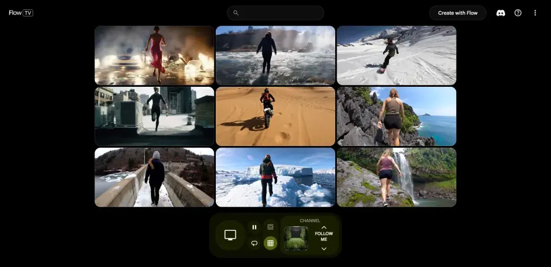 在主页右上角点击“观看Flow TV”按钮,就进入了官方的案例展示页面,展示了使用 Google 的 Veo 模型生成的精彩片段,可以观看和学习其他用户分享的AI生成作品,获取灵感。