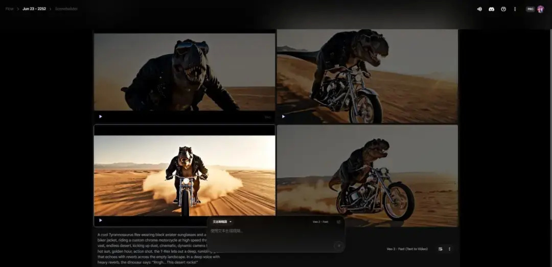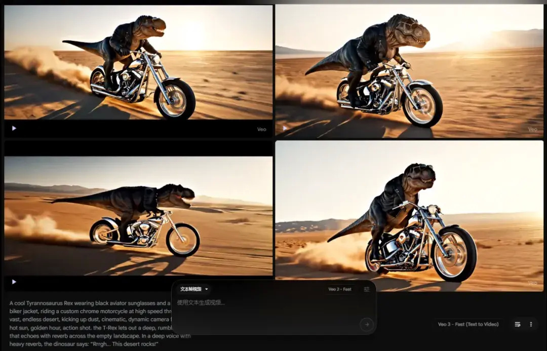 1.文本转视频: 白天霸王龙骑摩托穿越沙漠,并说沙漠真带劲。