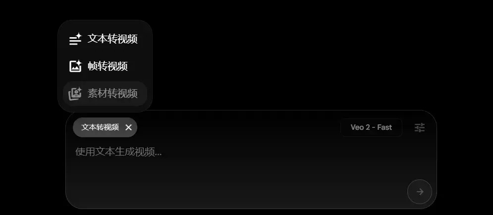 根据提示词生成视频片段。点击输入框左上角的“文本转视频”按钮,可以切换3种不同的视频生成模式:文本转视频(Text to Video)、帧转视频(Frames to Video)、素材转视频(Ingredients to Video)。默认为文本转视频。