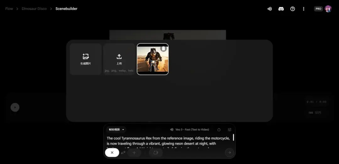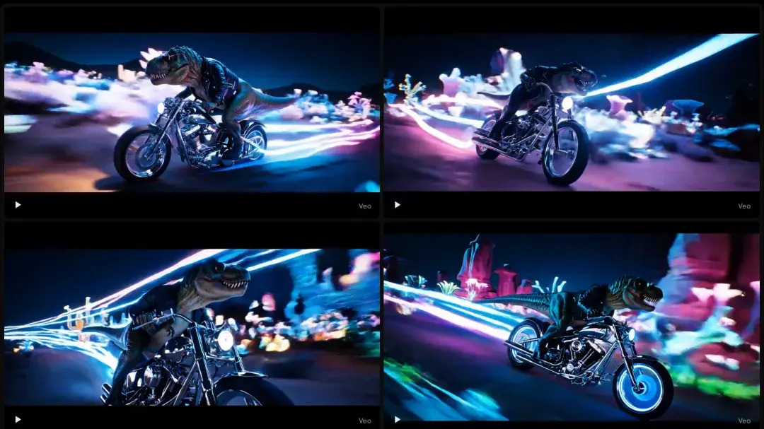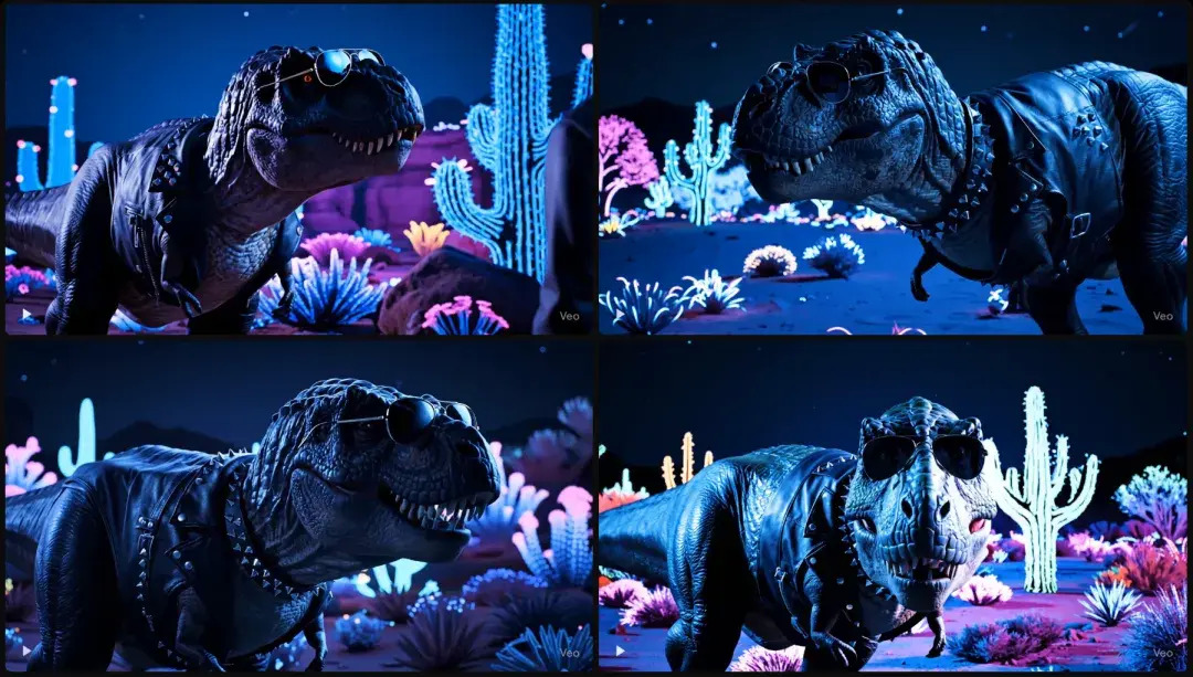 2.文本转视频:霸王龙骑摩托穿越夜晚霓虹沙漠