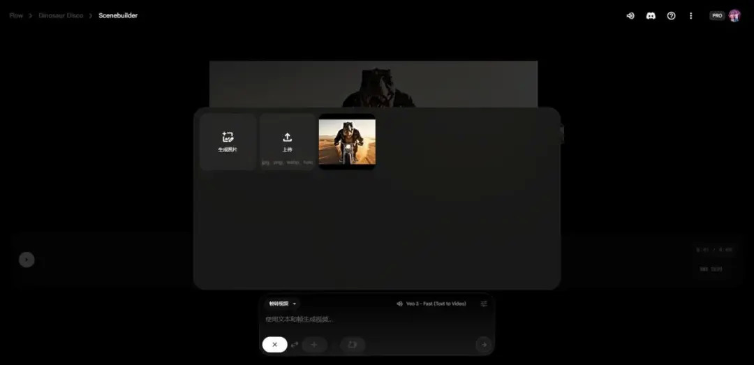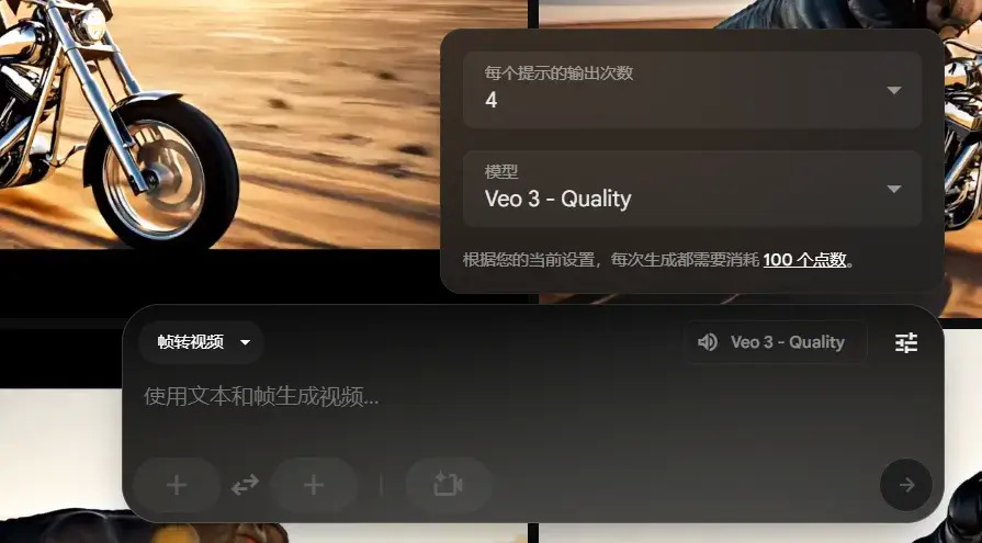 输入框下方出现2个+号,前面+号表示首帧,后面+号表示尾帧。点击+号,可选择重复使用以前的帧/上传本地图片/调用Imagen 4生成图片作为首帧、尾帧或首尾帧使用,支持分别用首帧、尾帧、首尾帧生成视频。