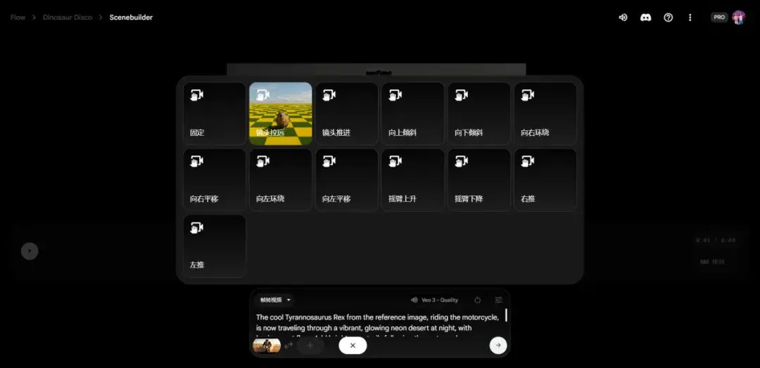 注意:如果使用这个运镜功能,则无法使用Veo 3模型,Flow会自动切换到Veo 2模型。但可以在提示词里设置运镜效果。