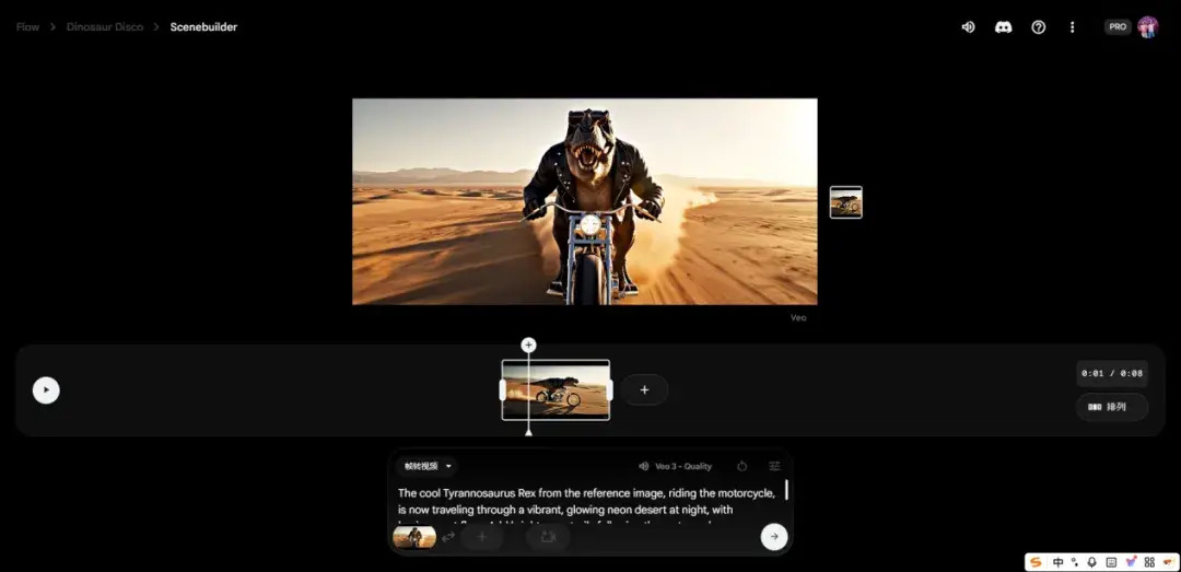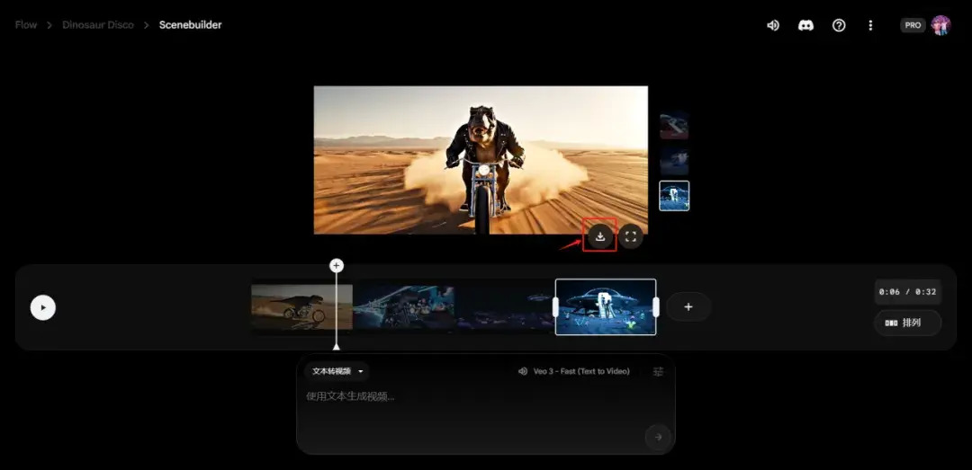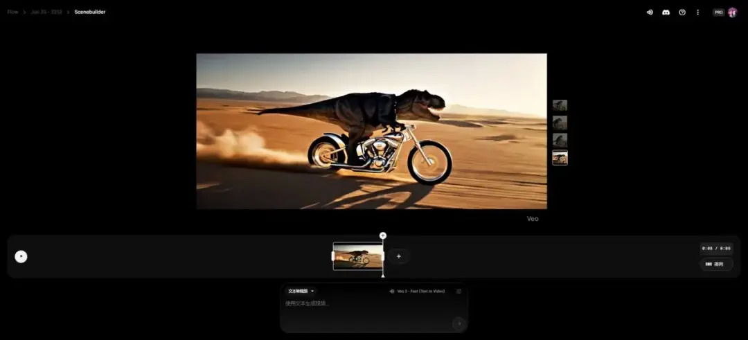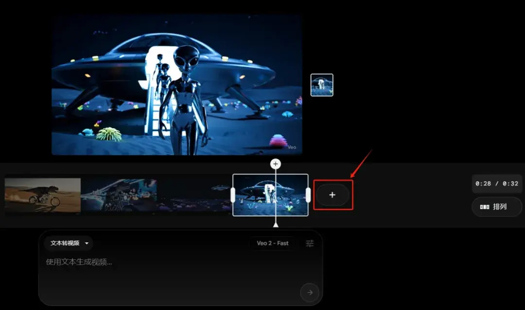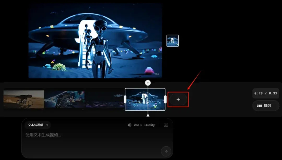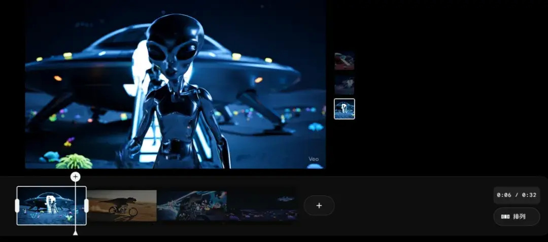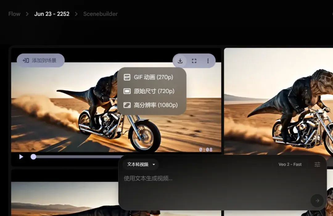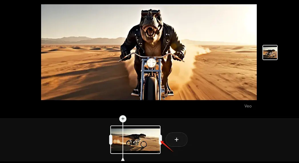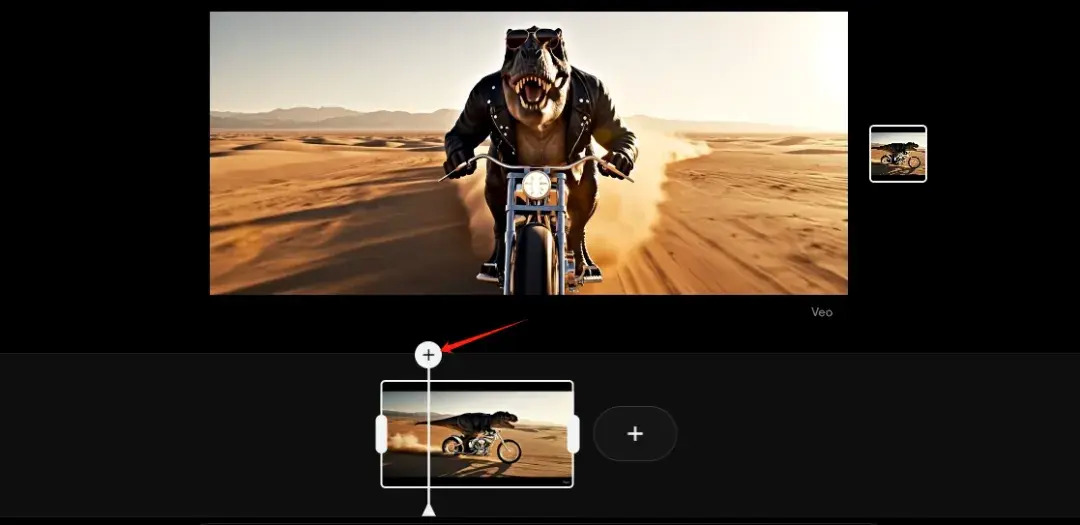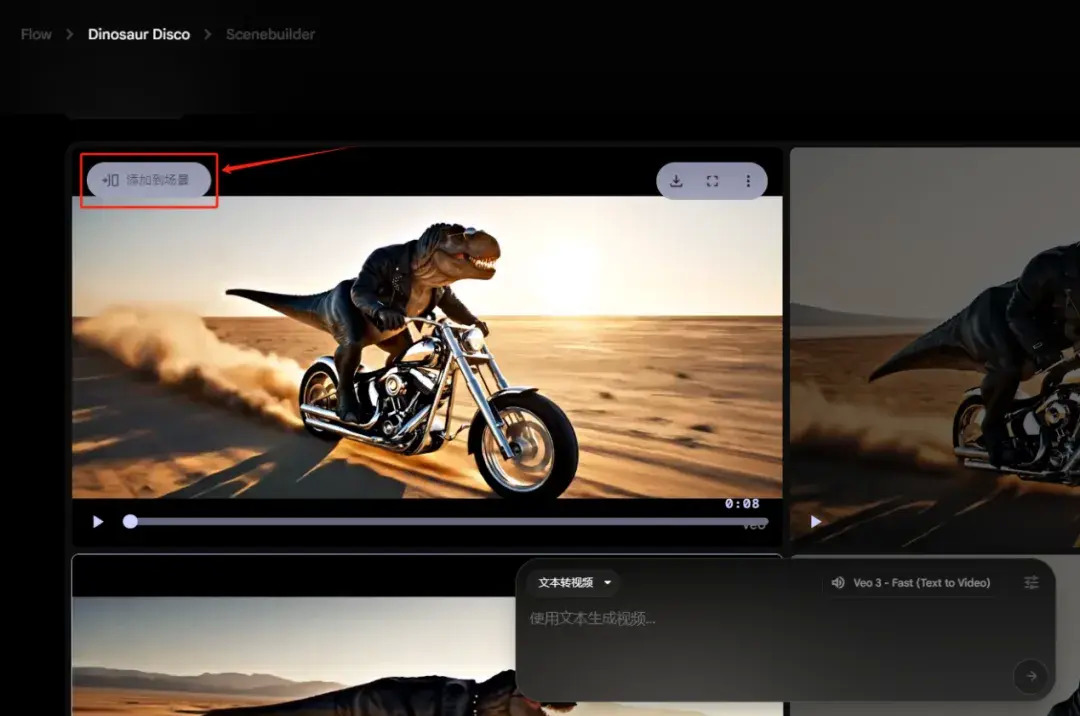 如果生成了满意的视频片段,可点击单个视频左上角的“添加到场景(Add to scene)”按钮,会自动加入到Scenebuilder(场景构建器)轨道中进行简单编辑。你可以无缝编辑和扩展现有的镜头,Gemini 将在后台智能辅助,确保内容或风格的一致性。通过连续的运动和一致的角色揭示更多动作或过渡到接下来发生的事情。