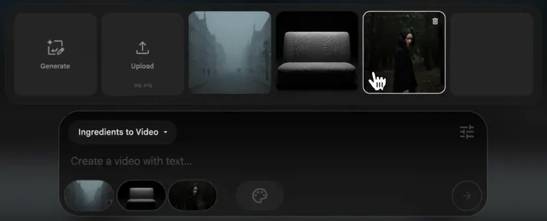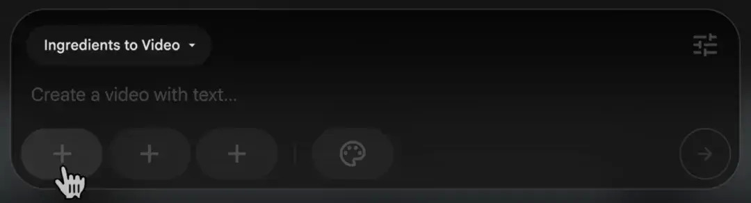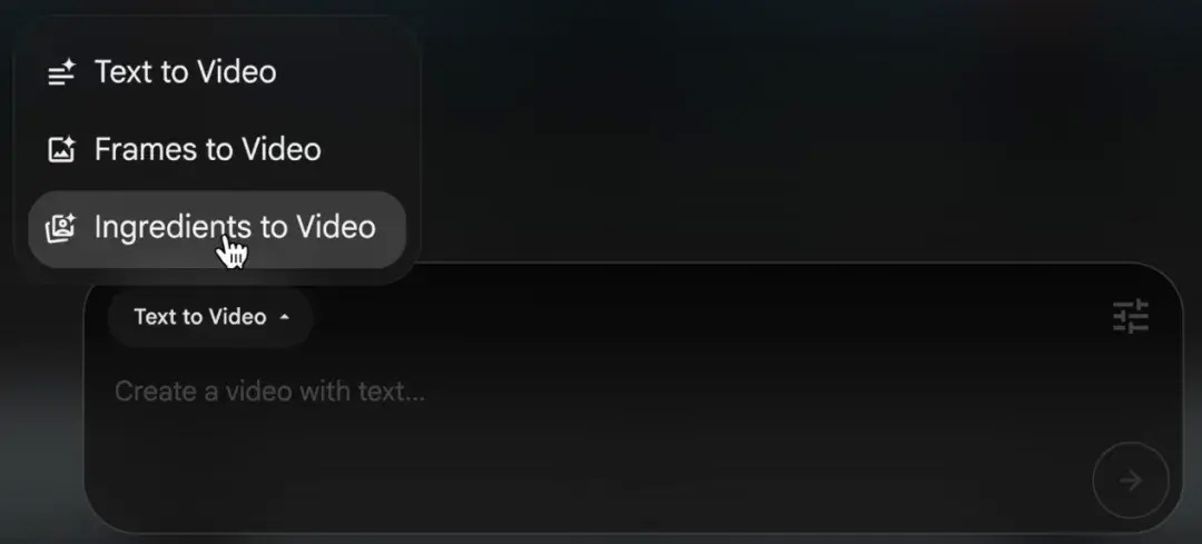 点击输入框左上角的“Text to Video(文本转视频)”按钮,切换到素材转视频(Ingredients to Video)模式。它类似于视频的帧,但不是使用图像作为首帧或尾帧,而是选择一些素材组合在一个场景中,并添加提示词,说明它们如何交互。