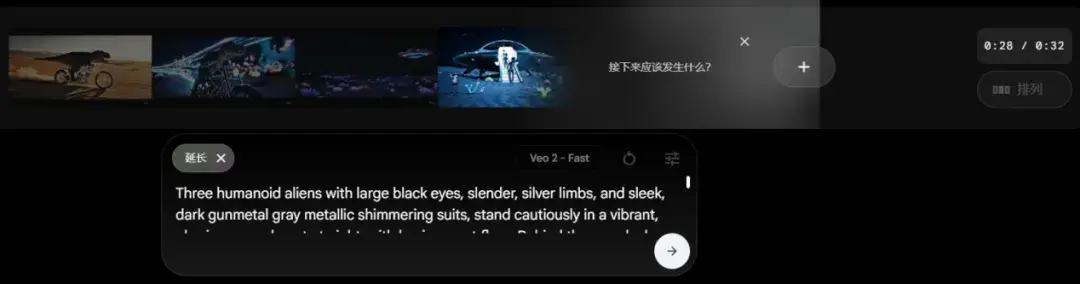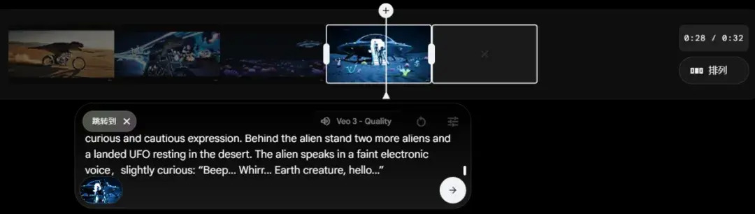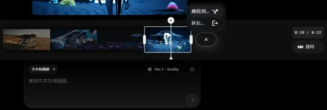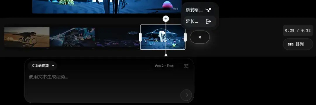 在场景构建器中,可以将多个剪辑放在一起来创建一个场景,也可以继续迭代创建下一个镜头。点击视频旁边的+号,弹出2个选项:跳转到、延长。它利用 Gemini 的功能来了解你之前的剪辑是如何结束的,以便按照你的提示词无缝生成下一个剪辑。 如果你想把一个视频片段切换到其他场景中去,就可以用“跳转到”功能,创建多结局体验。