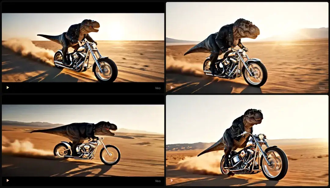 1.文本转视频:白天霸王龙骑摩托穿越沙漠,并说沙漠真带劲。