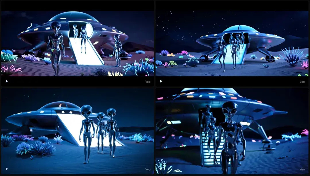 三名长着硕大黑眼、银色细长四肢的人形外星生物,身着光滑的深枪灰色金属光泽制服,从一架降落在霓虹荒漠中的银色飞碟发光坡道上缓缓现身。沙丘上的荧光植物泛着幽幽微光。外星人们显得既警惕又好奇,正观察着这片异星地貌。电影级中景镜头。
