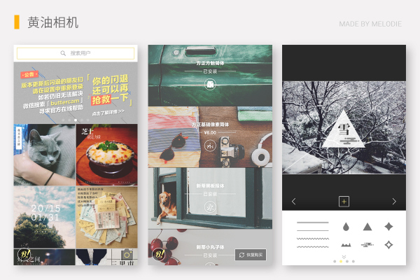 前 身为「食日谈」,变身黄油相机。 App 从一块黄油的 icon 就可以看出来它的独特;与一般的加水印加字的 App 不同,它只给出基本元素,让用户自行组合成水印,还引入了一些付费和免费的优质正版中文字库,可塑性很强,可玩性也很不错。这款 App 的「设计感」体现于其有意思的创意,在里面可以看到文艺青年们用点线面创作的一张张或文艺或逗比的照片,还可以 Ding 一下采用别人制作的水印拍照。还有,自己动手从排版和信息传达的角度去「设计」一张照片,这事儿本来就充满了「设计感」。不过后来知道国外的一款 App「Studio」早就有了类似的概念,可能黄油也有所借鉴吧。