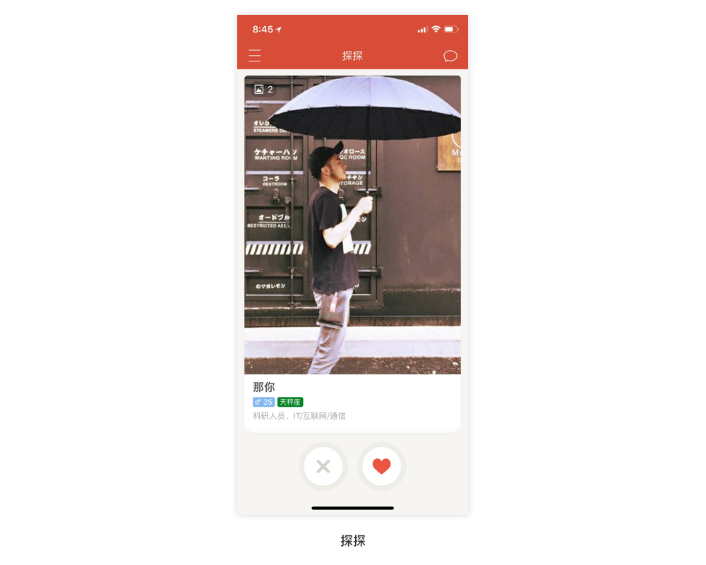 探探,运用卡片式设计,实现左右滑动代表感不感兴趣的操作,从而增加产品的趣味性。