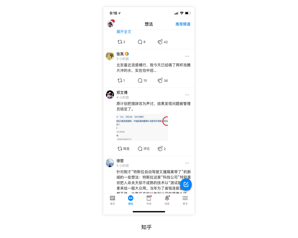 比如:知乎的“想法”feed流里,就是采用全出血分隔线的形式,让信息分隔的更明显,更加独立性。 (可以点击看大图)