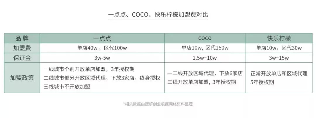 目前开一家茶饮店的综合启动成本并不低,如我们前文说的喜茶、奈雪の茶,启动成本就是几百万;一点点、 coco也要接近百万;那么选择一个适合自己资金实力和投资回报预期的品牌就至关重要。