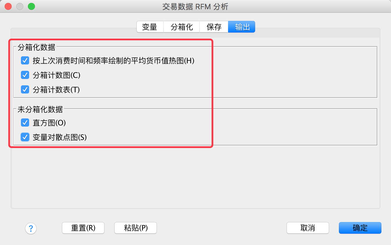 输出:可以全部勾选,为了能全面的解读RFM分析结果。