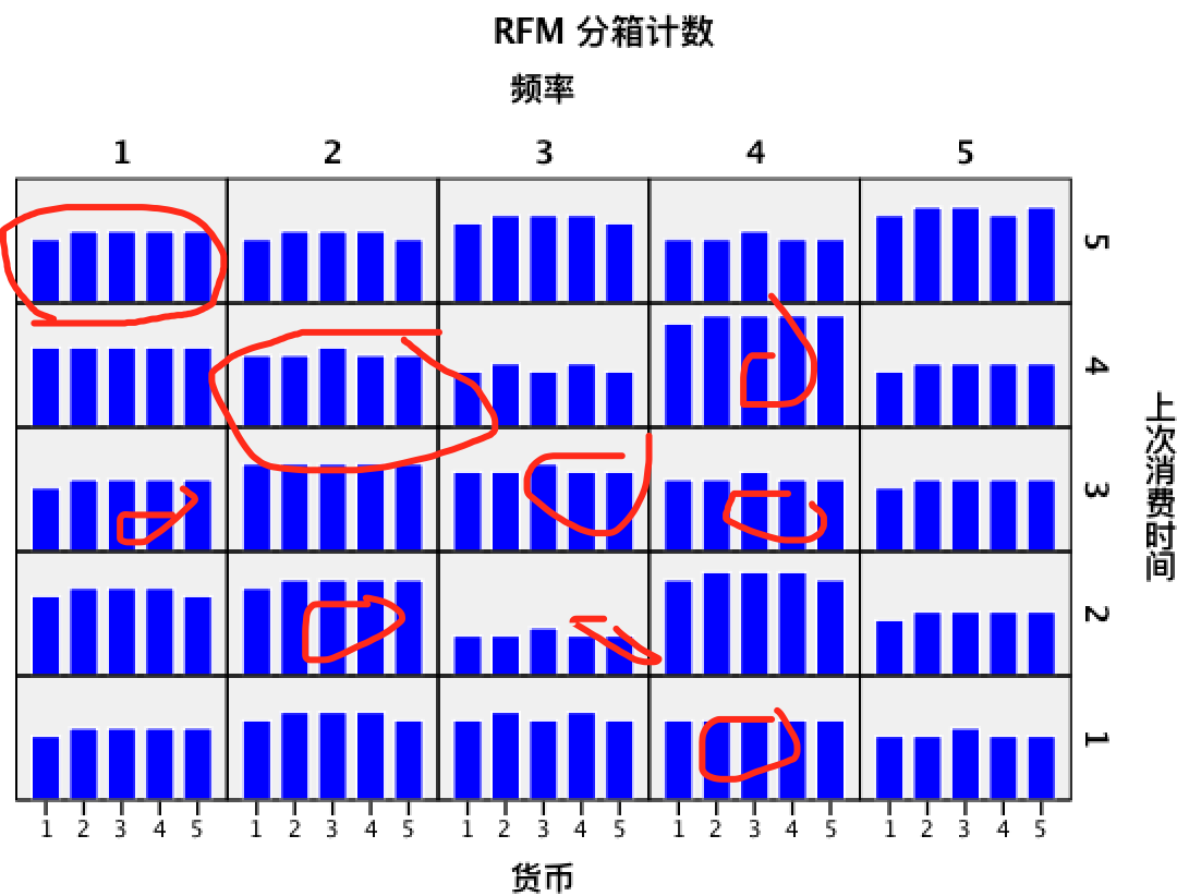 我们期望均匀的分布,若不均分,则应该重新考虑RFM的适用性或尝试另一种分箱方法(减少分箱数目或随机分配绑定值)。