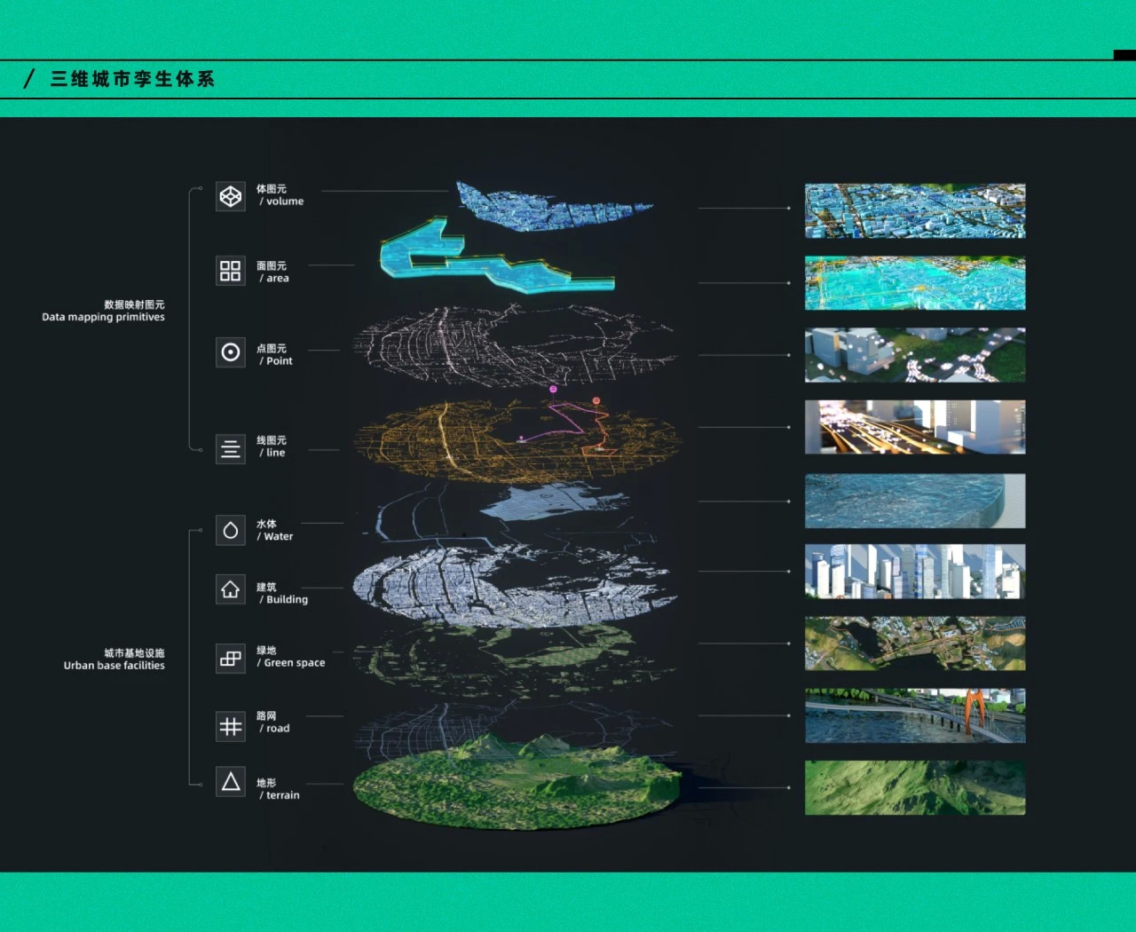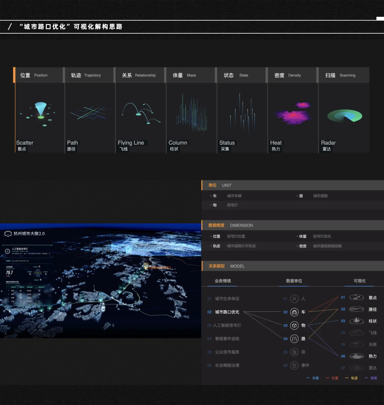 为了更好地构筑一个“数字孪生城市”,我们梳理并制定了“城市”的可视化信息呈现规范,它就好比最基础的骨骼和结构,定义了所有的信息以什么样的形式和层级,才能井井有条地清晰呈现给观者。