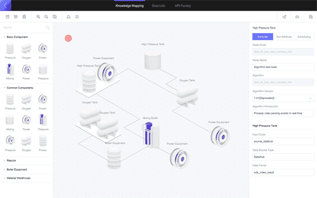 在工业制造领域,技术人员需要处理很多零散的设备测点数据,并对产线建模的过程进行模拟。对于他们来说,熟悉的是实实在在的工业设备,而不是抽象的表格与图标。在工业大脑产品中,我们定制了更容易辨识的 3D 设备模型,用户可以根据具体的产线,通过拖拽的方式进行配置。从而,实现了物理空间与数字空间的交互映射,融合共生。