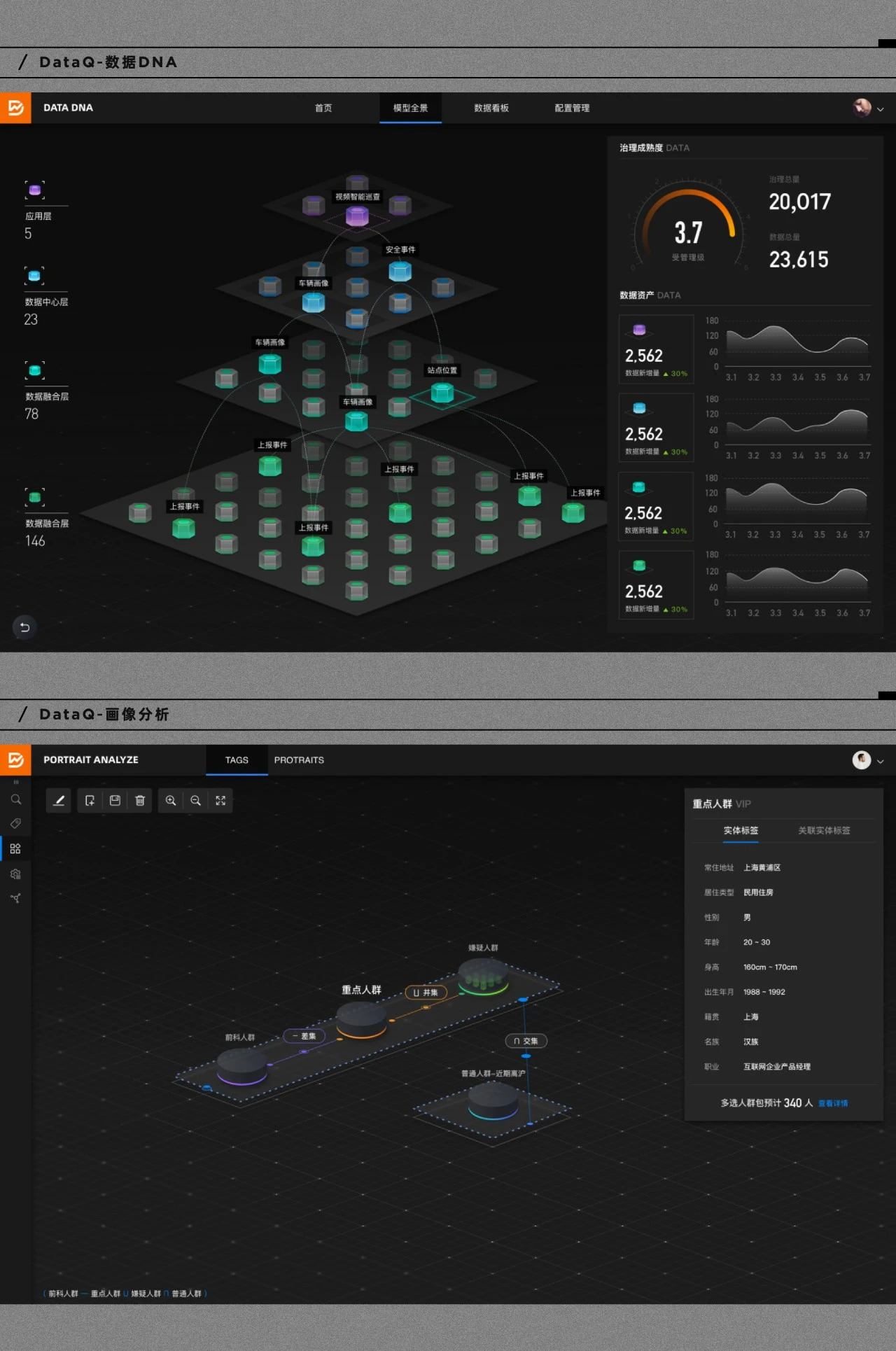 不仅在各行业产品中,具象化的表达也在数据中台场景中为使用者带来价值。DataQ 作为全域数据汇聚、融合、开放共享的数据创新平台,为城市大脑提供全量、标准、干净、智能的数据资源。在数据 DNA、画像分析等产品中,用户需要在繁琐的数据流转链路中溯源成为最难攻克的问题,在此设计师尝试通过三维立体的效果,用内容分层确立层级架构,构筑数据域链路动态展示数据依赖关系,让数据关系变得更为清晰、直观,在多维数据的场景中提升了信息的触达性,同时将原本复杂枯燥的数据治理过程变得像 Candy Crush 和 Lego 一样有趣。