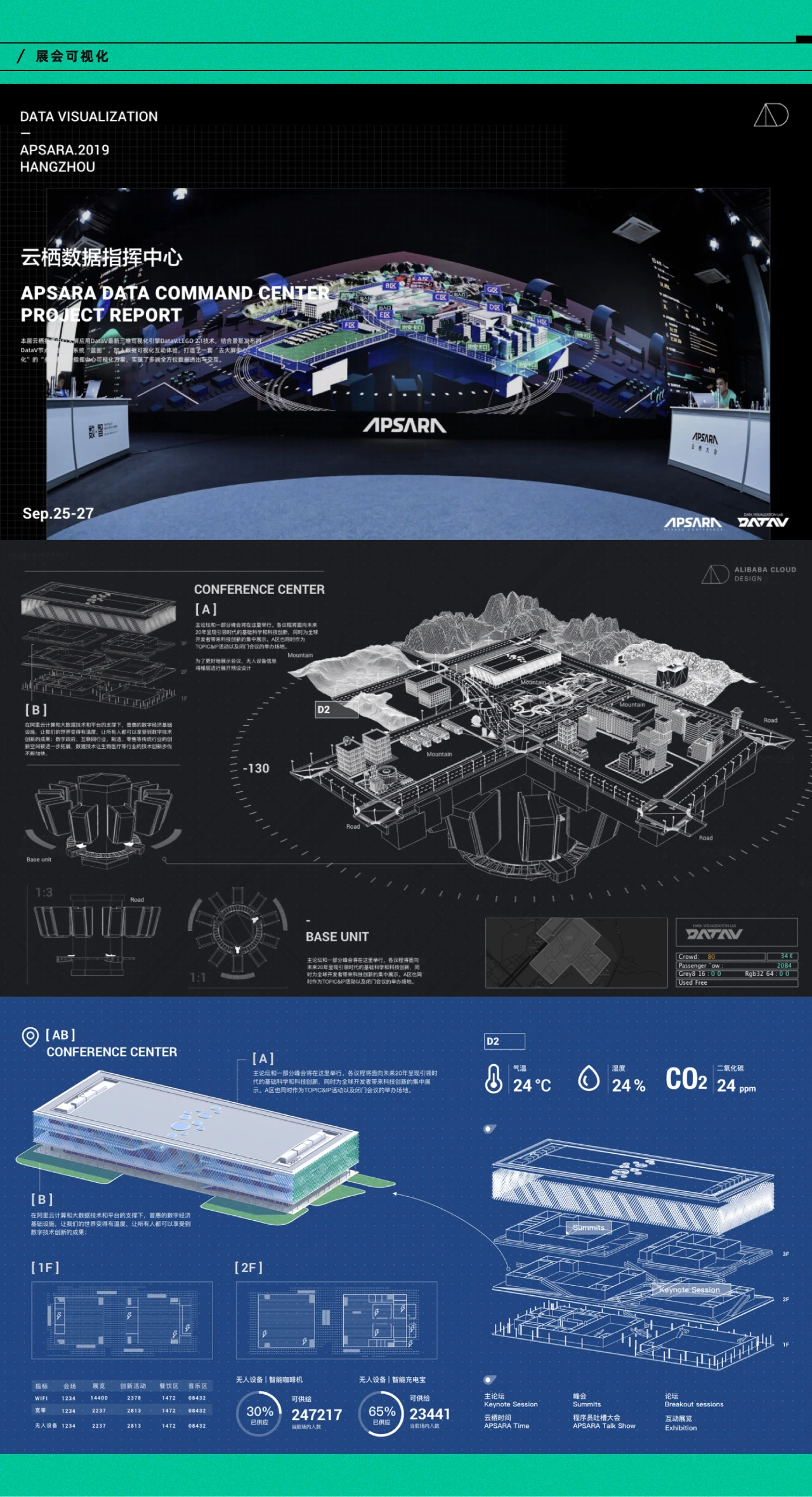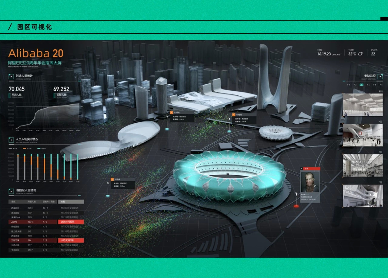 云栖指挥中心大屏是应用DataV最新三维可视化引擎DataV LEGO 2.1技术,结合最新发布的DataV节点编程交互系统“蓝图”,打造了一套“去大屏中心化”的“多屏多端”指挥中心可视化方案,实现了“数据大屏”、“触控指挥台”、“Pad移动大屏”、“移动端核心指标看板”4合1全方位数据透出与交互;解决了以往数据大屏“只能看不能用”的行业痛点,受到项目方与来访行业专家的一致肯定,开创了行业先河。