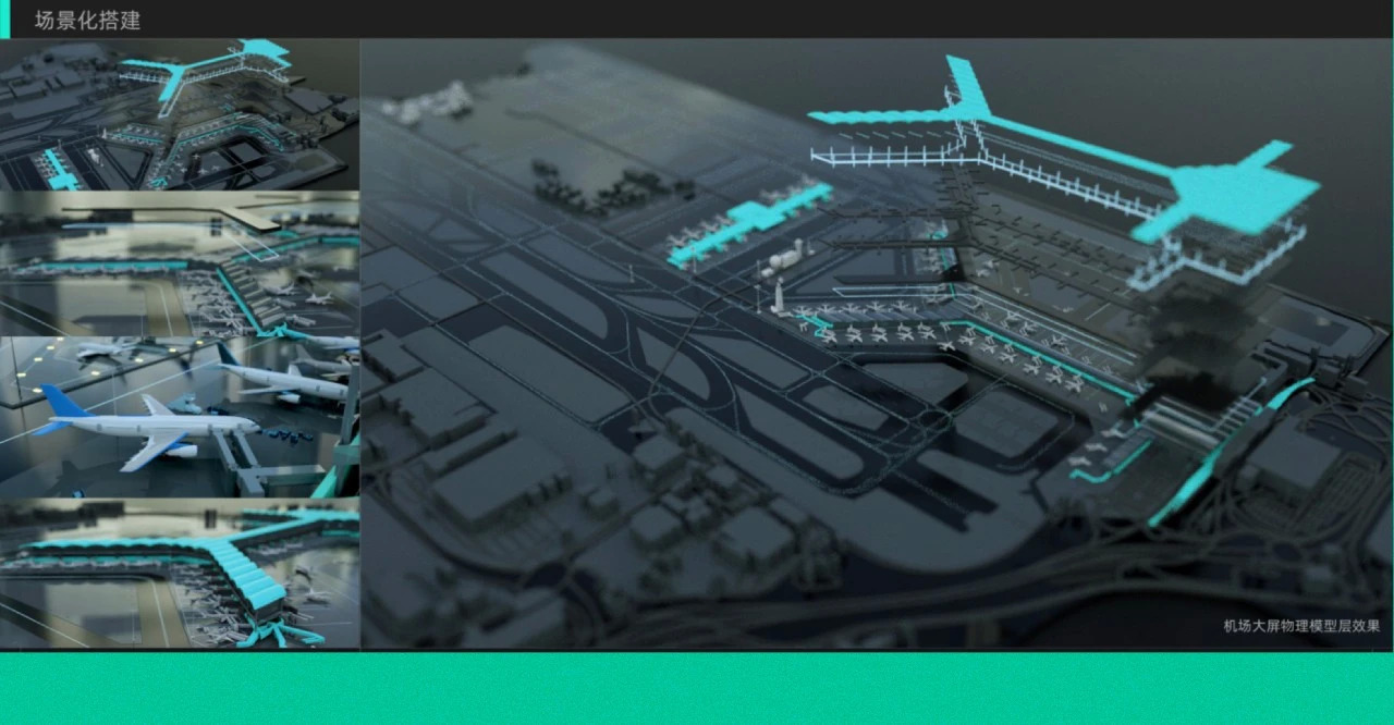 在航空领域,将客流、航班、运货小车、建筑等信息提取出来,通过搭建一站式的、直观的机场运作大屏,从客户需求分析与各维度数据梳理,到可视化设计创意与脚本动线设计、再到高保真业务场景的线上搭建,以此撬动机场业务数据融合、数字治理和智能管理的契机,迈向智能机场管理。