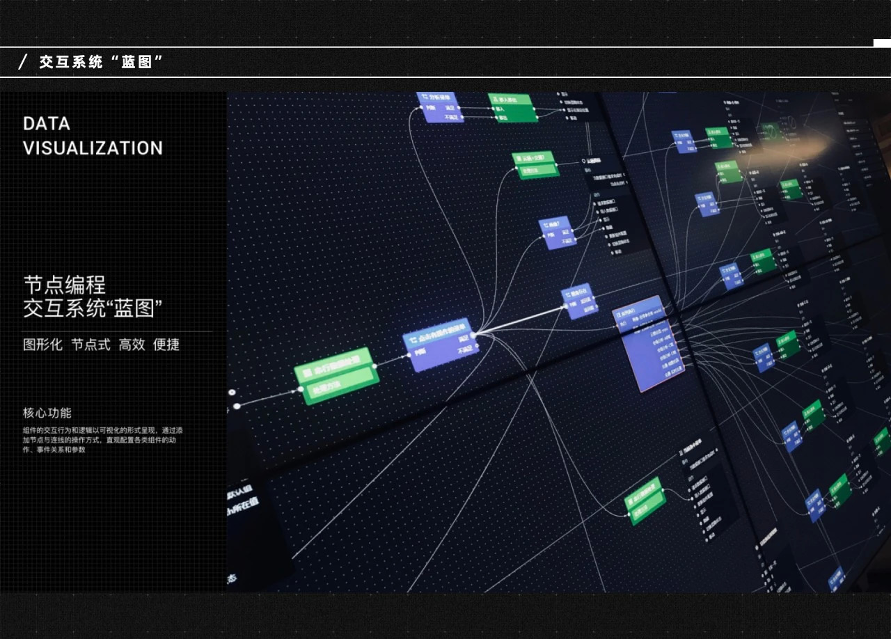 多端联动的背后,是产品内的蓝图编辑器,以可视化节点拖拽的形式进行数据与事件交互,包括强大的事件管理、交互搭建与场景数据管理,帮助用户更好地展示与阅读这些种类繁多的数据,以及现实中的场景事件如何展示与联动数据。