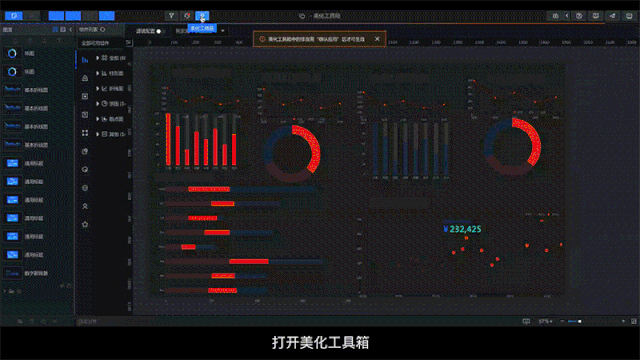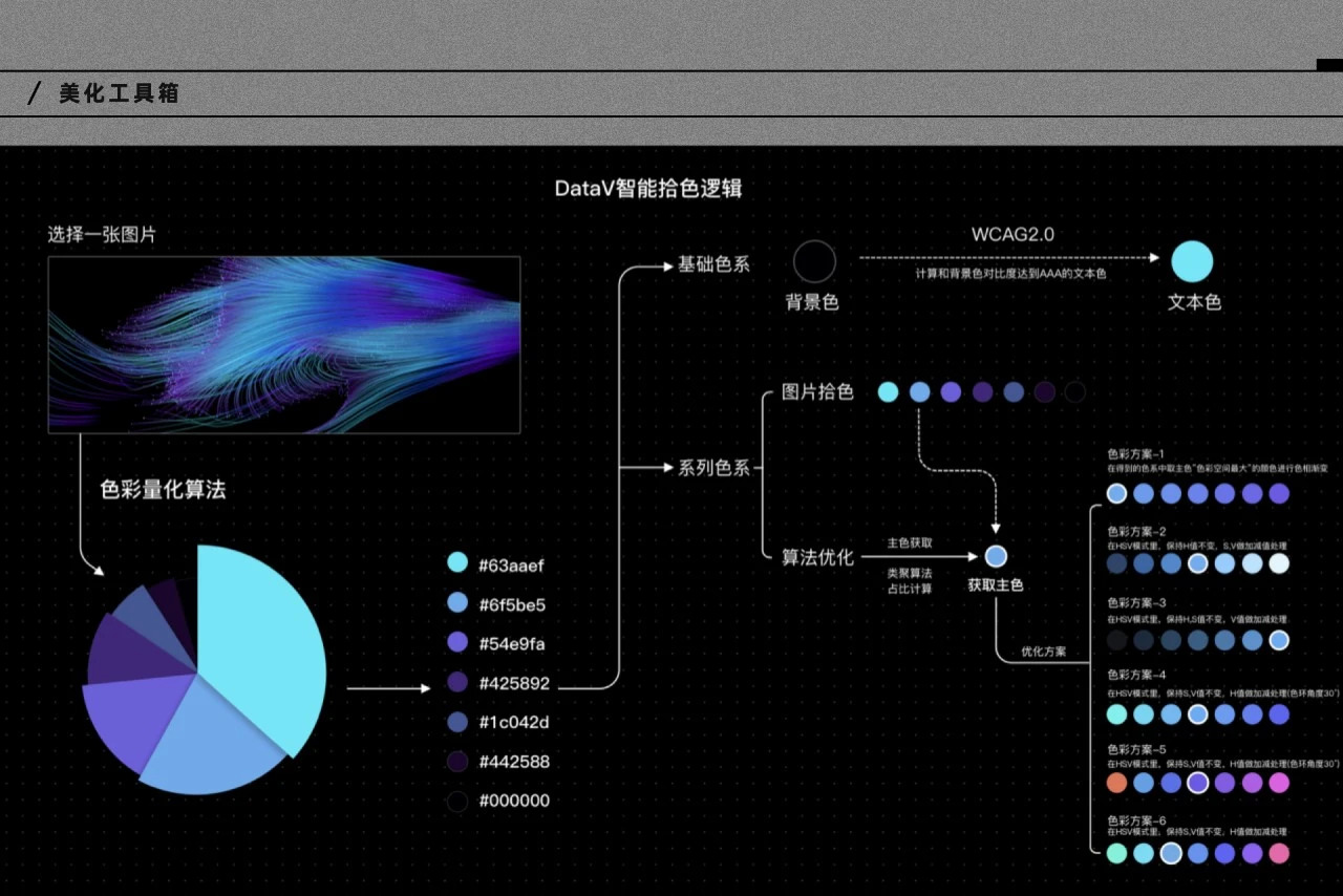 为了保证最终的设计交付质量,我们在DataV里推出了美化工具箱。你只需要接入你的数据,大致放好组件。DataV能通过算法识别到你的大致布局,而我们的设计专家系统会推测你的设计意图,并自动进行布局优化。例如如果想要对配色进行修改,只需要上传一张自己喜欢的图片,就可以通过智能主题功能从图片中吸取合适的色彩,在保留原图片风格的同时兼具美观和清晰度,实现大屏项目全局快速配色,减少繁琐操作。这背后不仅仅是简单的几条设计规则,而是可视化设计师对于布局规则、色彩原理、识别度规范、可视化标准进行充分归纳后形成的设计专家系统,和深度学习算法结合后,固化下来的综合经验。