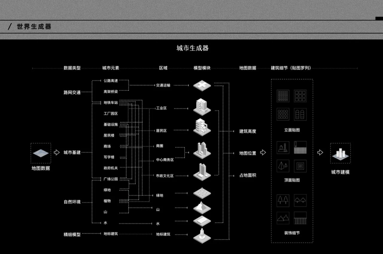 而现在,你甚至可以拥有一个属于自己的孪生城市。通过“城市生成器”功能,任何人只需要在地图上圈定一块区域,就能一键生成三维数字孪生城市。而这背后,是设计师将城市元素拆分重组,工程师们把城市数据结构化,让机器按照特定的规则,分层自动化生成的城市元素。