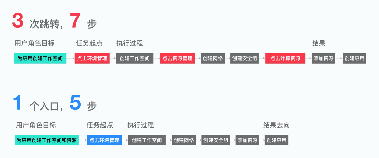 举例来说,运维平台的核心角色运维人员需要为应用创建工作空间,按照梳理出的任务流,用户需要经过3次跳转7步完成,那这个是否还有优化空间呢?