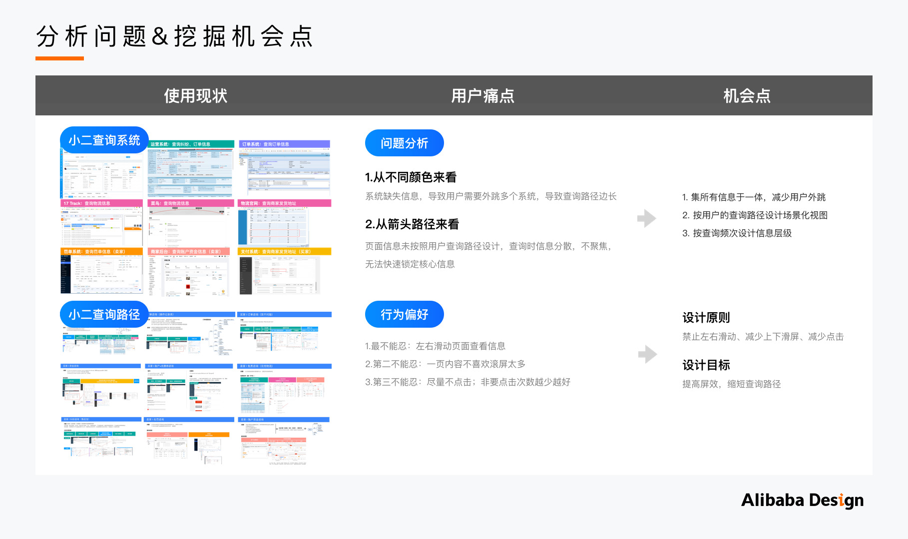 按照归类场景,梳理小二具体的查询信息及路径。内容包含:流程+具体路径+具体信息+信息作用+页面截图(截图能让其他人在看你报告时体感更强,也更易理解)。梳理完后,会对业务和用户有了非常深入的理解,这为你之后报告和设计环节提供强有力的依据支撑。