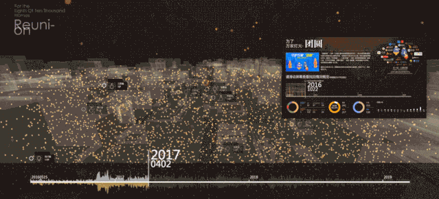 而基于上面的跌落态势图,在2019年的国家安全周上,我们制作了一个可以进行交互的可视化装置。通过操作触摸屏,参展群众可以非常清晰地了解儿童走失事件在时间上的分布情况,以及走失的原因,从而在一定程度上直观地掌握走失事件的状态和趋势。