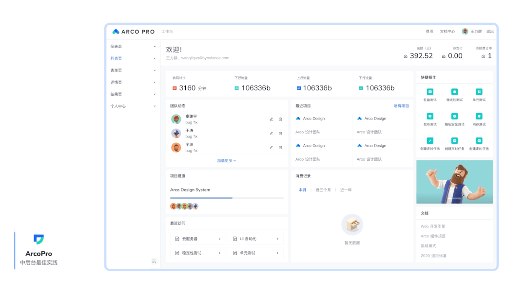 为了帮助用户更快速地从 0 到 1 搭建项目,Arco 提供了最佳实践 Arco Pro,整理了常见的页面场景,帮助用户快速初始化项目和使用页面模板。