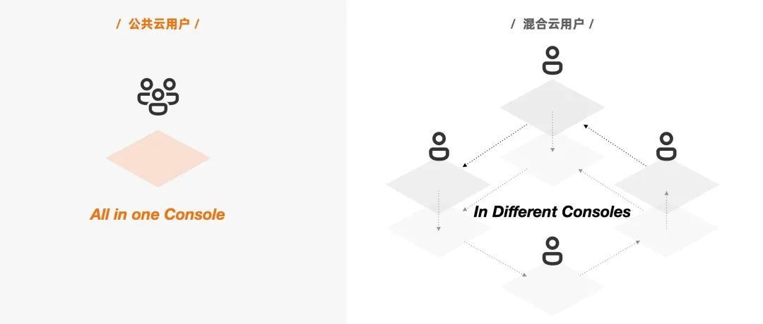 相比公共云几千万的线上用户数,混合云用户数可谓寥寥无几。公共云上人人都是 DevOps,是服务的开发者,是原厂工程师。用户只需在一个控制台上购买产品和服务,出现故障也无需担心运维修复,因为这些问题都会被云厂商自行解决。混合云以大型企业用户为主,部门多、角色多、需求差异大,难以在一个控制台完成所有工作。每种角色都是一个专业的群体,All in one Console 的产品思路可能会让控制台变成一艘航空母舰,但对于每个岗位的专家用户而言 “大而全” 不如 “少而专”。