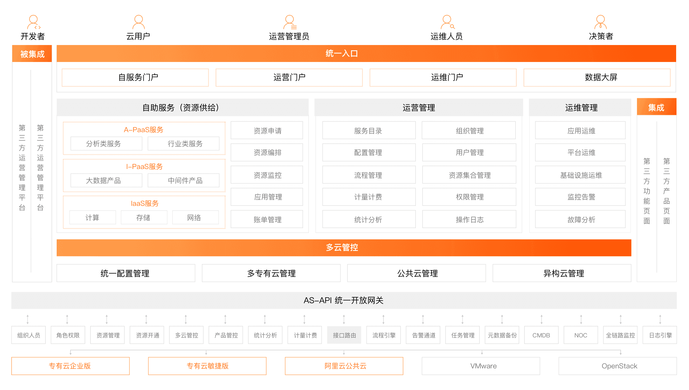阿里云混合云管理平台(Apsara Uni-manager)是面向阿里云专有云和混合云场景的企业级云管理平台,提供全方位的云资源供给、运维和运营管理能力,具备一体化管控、自动化运维、智能化分析及个性化扩展等核心竞争力;致力于为客户提供优质的用户体验,简化混合云管理,加速政企数字化转型。