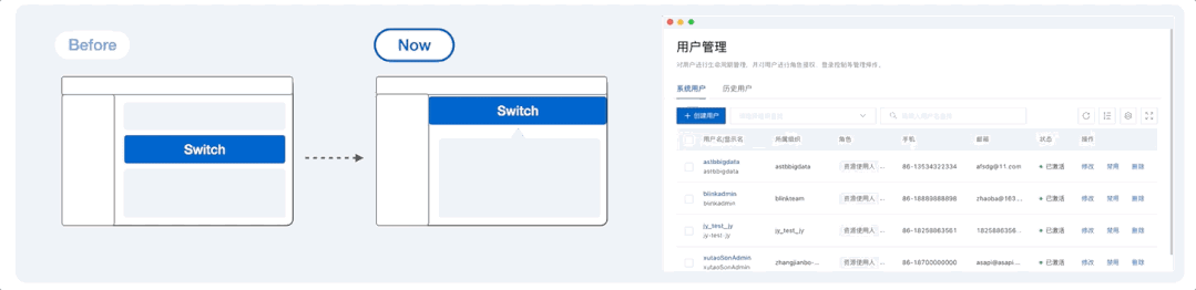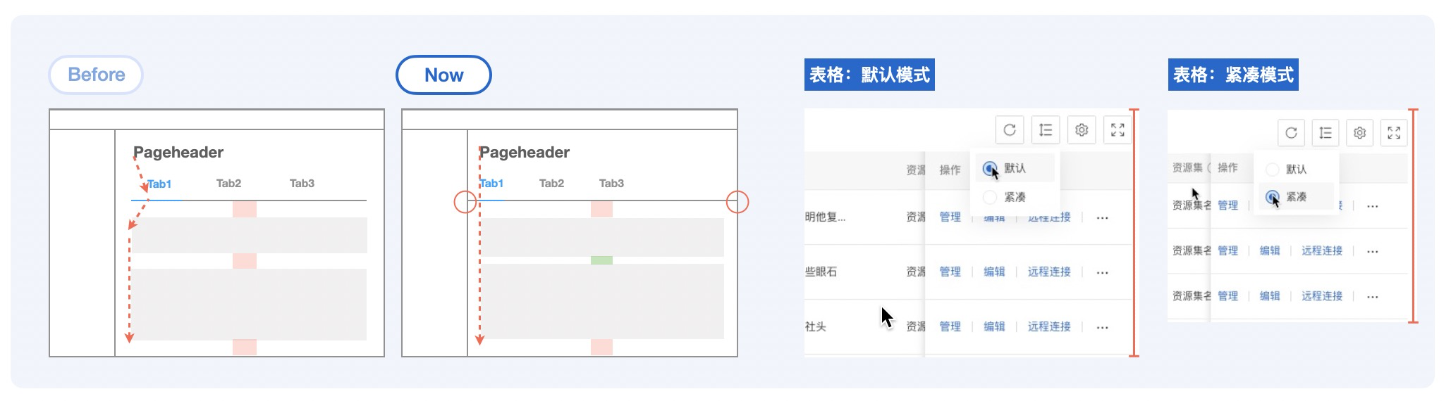 【高密度】让同一层级或关联性强的内容聚拢,减少留白。比如,我们让每个表格都具备了紧凑模式,让用户在一屏中能多看30%的内容。