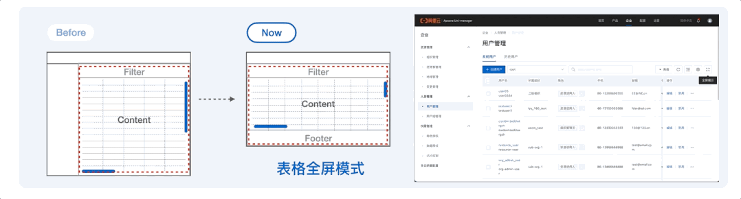 我们对控制台中的所有表格都内置了一种“全屏模式”的交互态。在全屏模式下,表格高度始终固定,纵向和横向滚动条能在首屏就被看见,方便用鼠标拖动;从信息传达角度来看,全屏也加大了表格宽度,让更多表头字段在一屏内同时得到暴露。