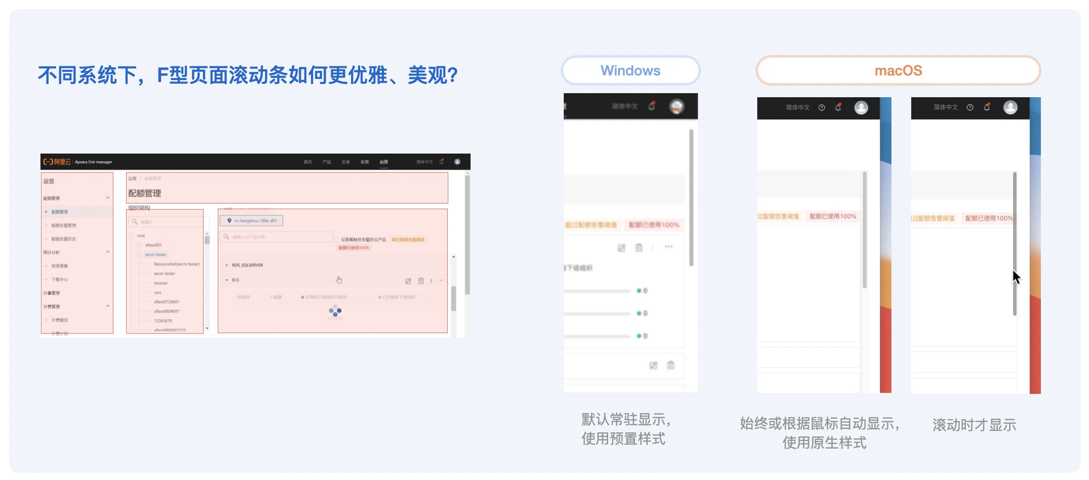 另外,我们还关注到大部分企业用户电脑是 Windows 系统,而设计师常用 macOS 进行设计,很多系统差异带来的细节点会被忽略。比如,macOS 上已经存在覆盖式滚动条,该操作系统有”始终显示/滚动时显示/根据鼠标显示”三种模式可选,而 Windows 10 前还没有一个设置来控制滚动条的可见性。这就导致 Windows 10 之前系统下的“F型”页面滚动条“又多又粗”,视觉上非常不美观。所以针对 Windows,我们对滚动条进行了样式覆盖预置,让滚动条看上去更优雅、更美观。不过,近期微软也宣布将重新设计非覆盖式滚动条,以适应 Fluent Design 的设计理念,并在 Windows 11/10得以运用,我们需要保持关注后续如何适配新系统的变化。