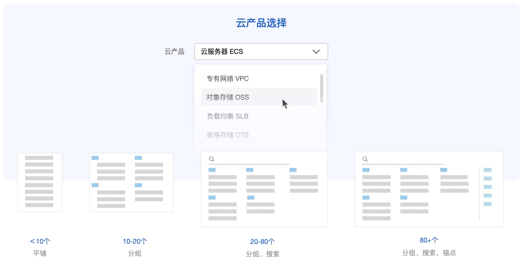动态获取导致下拉面板的菜单个数容易发生变化,比如有些客户可能购买了上百款云产品,有些客户只购买了几个,“一刀切”的面板样式难以承载动态数量的菜单展示,而有些数据结构是相对固定的。比如,同一云厂商的云产品都有“一级分类”→“云产品”→“二级资源”这样相似而稳定的层级结构,所以就有可能根据层级和数量推导不同样式,并封装在一个大组件里,在超量时提供分组、搜索和锚点能力,让选择更快速。