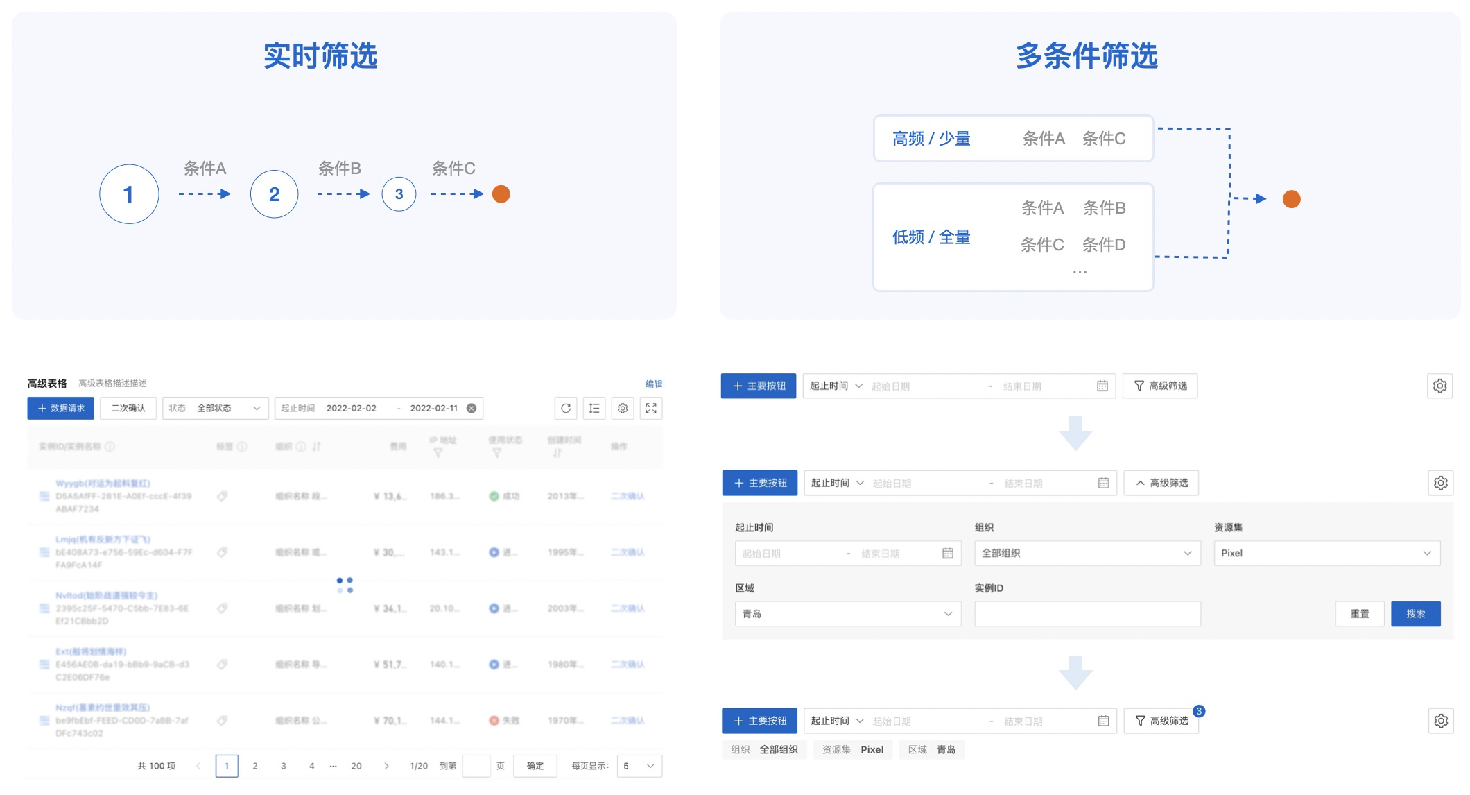 我们将数据过滤收敛为“实时筛选”和“多条件筛选”两种过滤模式,满足不同条件个数、不同查询频次的使用诉求。“实时筛选”是一种逐步缩小范围的查询心智,适合条件个数不多的业务场景;“多条件筛选”是一次性多个条件并发查询命中结果的心智,适合条件个数多而且复杂、接口实时查询慢的业务场景。在多条件筛选中,我们将某些高频条件常驻在面板外,提高内容的曝光率。
