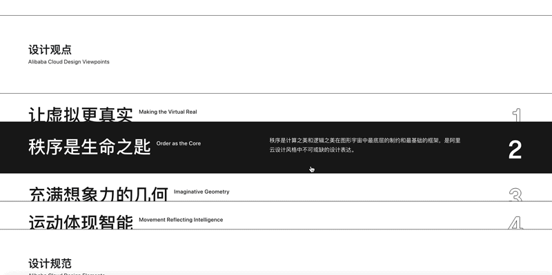 作为设计语言的最佳实践,阿里云首页改版灵活的应用了设计语言的4大关键词:「虚实」「秩序」「几何」和「运动」,作为首页改版视觉升级的核心观点,给予风格的指引和设计的推导。