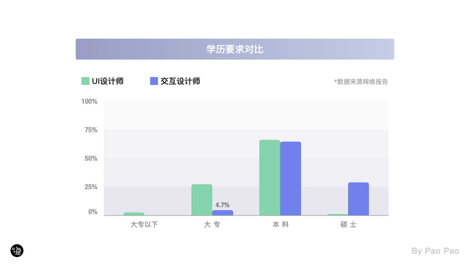 对于想要直接转交互设计师的朋友们,面向中小型企业可能需要掌握一定的UI或视觉表达能力,至少看过了大多数交互设计师的招聘JD里是有要求的。而面向大一点的企业则会对交互设计的软能力/学历要求更高,主要涉及到前期的各种需求研究分析、痛点解决优化、流程设计、开发跟进验收,产品优化创新等。学历要求则是本科以上为主,与UI设计相比下,虽然学历要求更高但是对专业会放的更宽一点。