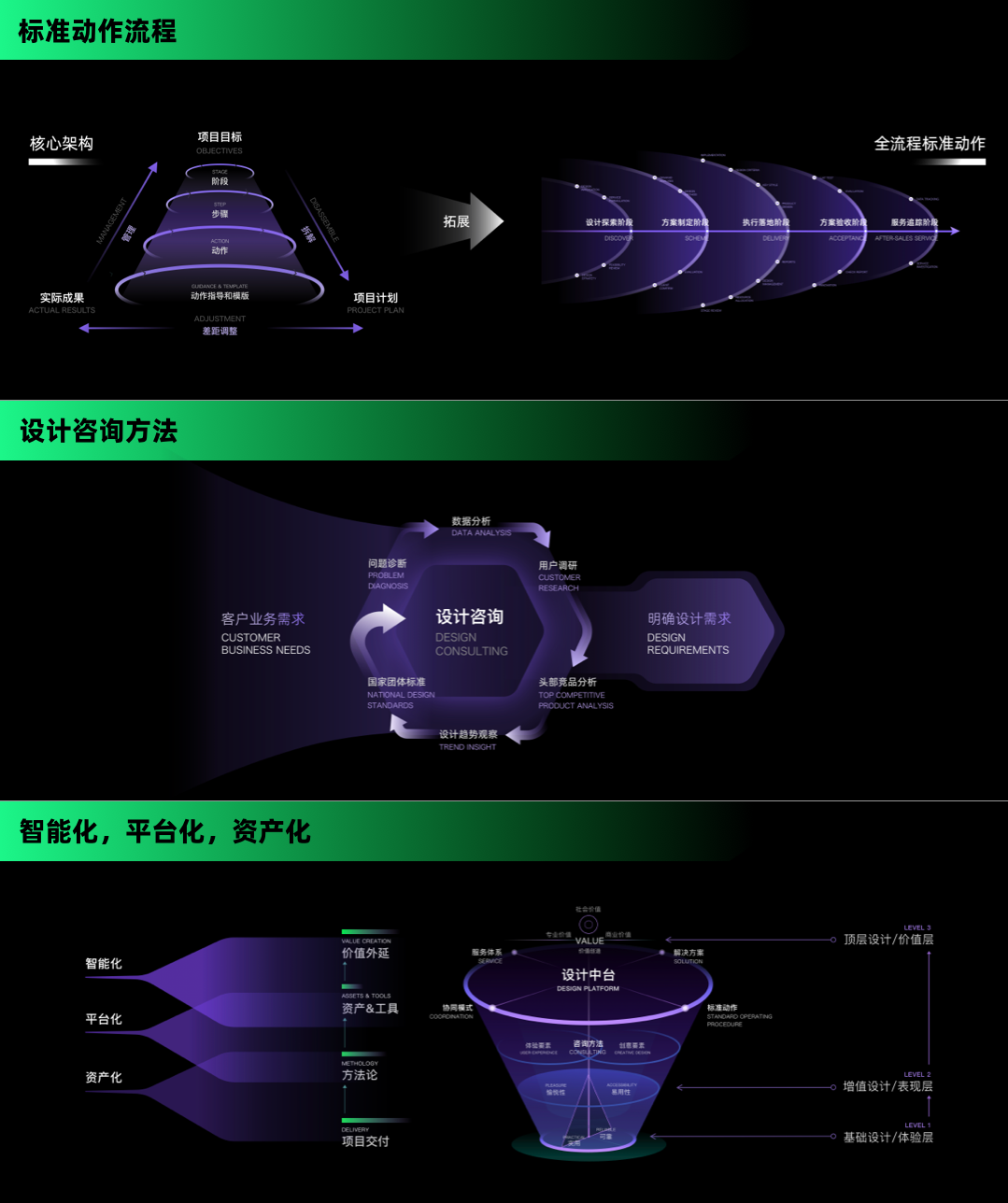 通过对上百个项目中的客户诉求和项目痛点进行归集,我们逐渐提炼研发出了服务体系、标准动作、咨询方法、协同模式、解决方案这5套设计创新体系和流程,并将其融入到设计中台,打造平台能力。资产化、平台化和智能化将成为设计服务创新的必要方式。