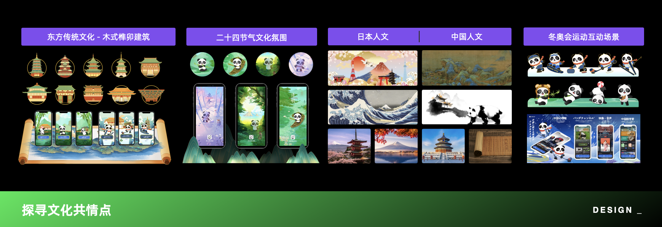 通过国风文化IP个性化创意:全场景定制趣味东方熊猫IP,通过对日本传统美学和中国特色东方文化的研究,提炼传承以及结合了东方传统文化与当代美学。例如:打造中国24节气创意场景、冬奥会运动全场景系列融入咨讯互动模块,让海外用户全面、细腻地感受产品传递的文化气息。
