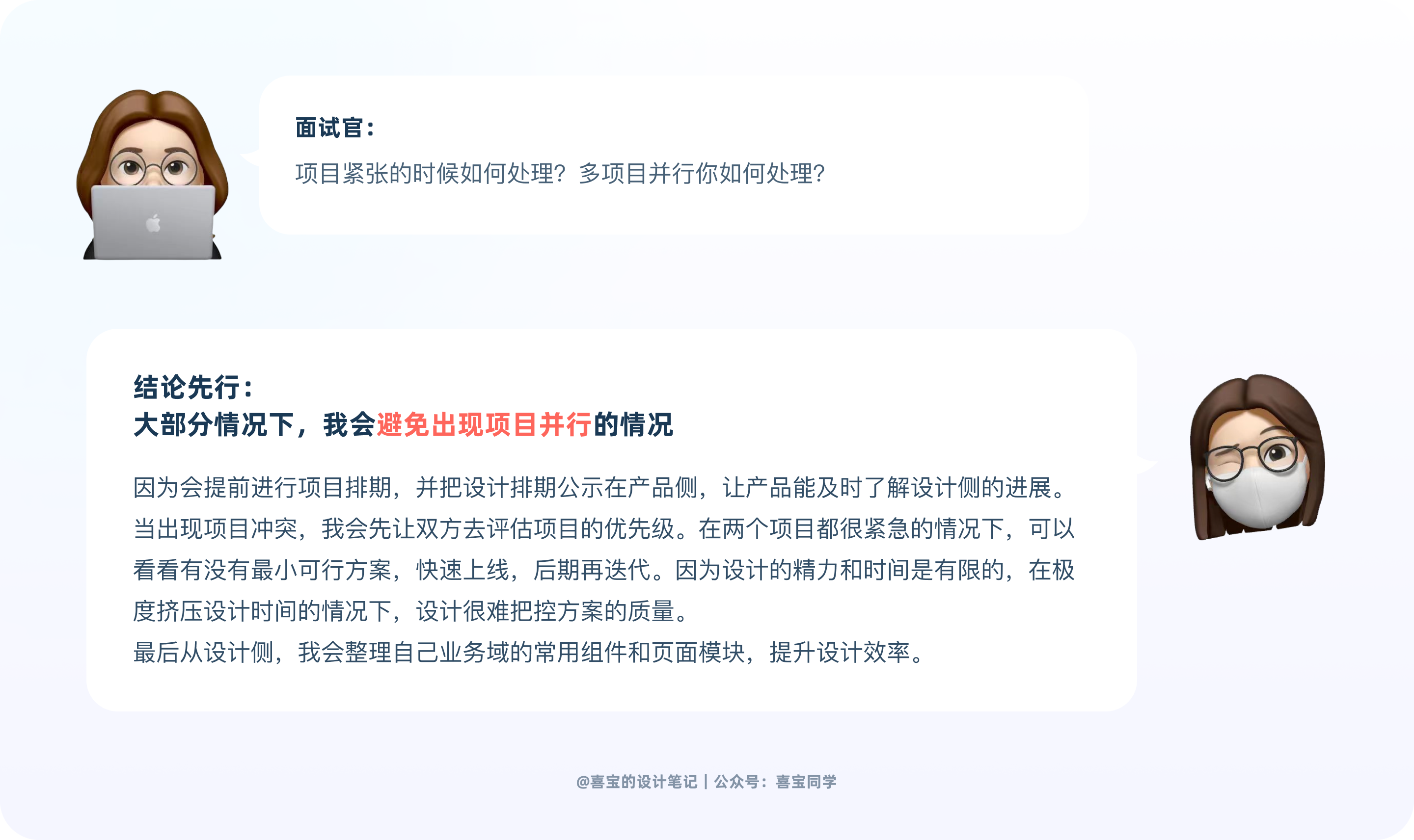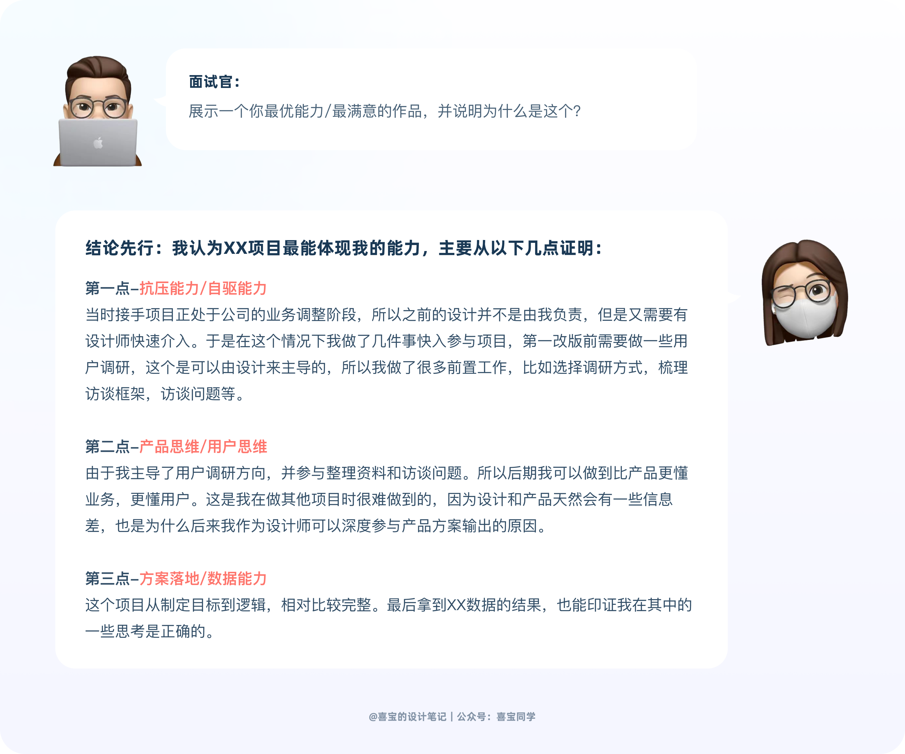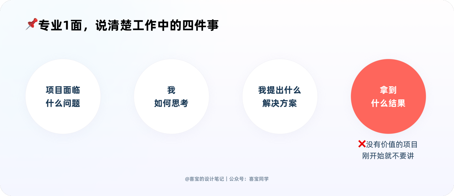 重点是,在专业面中我们需要说清楚在之前的工作经历里,当你面临一个问题时是如何思考,如何解决的,并且最后拿到了什么结果(划重点!!很多时候设计师,都在专注于解决问题,或者是输出设计稿,而忽略了业务结果)